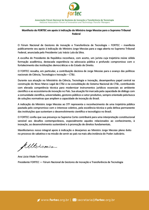 O Fórum Nacional de Gestores de Inovação e Transferência de Tecnologia – FORTEC – manifesta publicamente seu apoio à indicação do Ministro Jorge Messias para a vaga aberta no Supremo Tribunal Federal, anunciada pelo Presidente Luiz Inácio Lula da Silva.
