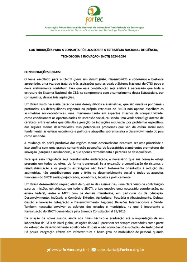 Com o envio deste documento, o FORTEC reafirma seu compromisso com a construção de políticas públicas de longo prazo para a ciência, tecnologia e inovação, fortalecendo a atuação dos NIT e contribuindo para uma estratégia nacional alinhada às necessidades do ecossistema brasileiro de inovação.